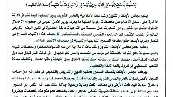 بيان استنكاري صادر عن مجلس الأوقاف وشؤون المقدسات الإسلامية عن تصريحات وزير أمن الاحتلال 22 صفر 1446ه